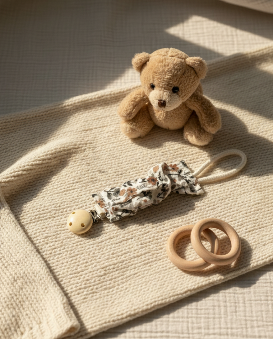 L’attache-tétine Juste Inséparables allie douceur, sécurité et style.