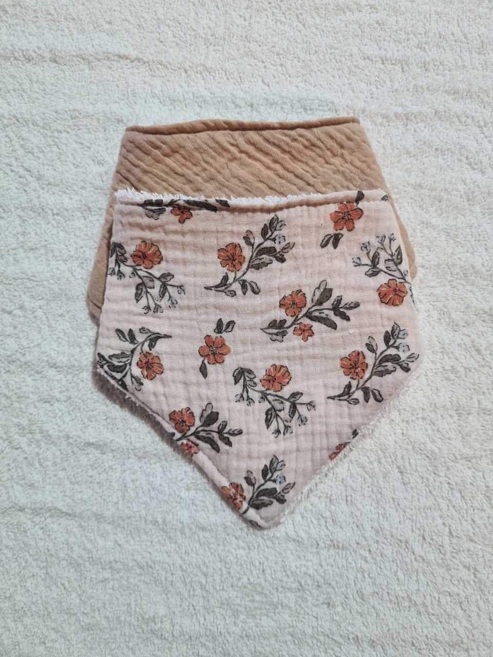 Le lot se compose d’un bandana uni latte et d’un bandana fleuri aux tons beige, kaki et pointe de safran, un mélange élégant et naturel qui s’accorde parfaitement avec toutes les tenues de votre enfant.