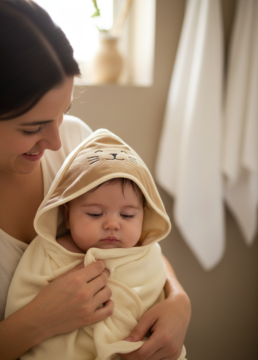 Accompagnée de son gant assorti, cette cape de bain transforme chaque sortie du bain en un moment plein de douceur et de complicité.