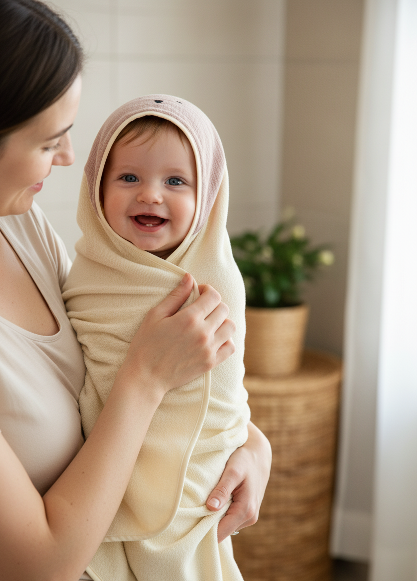 Accompagnée de son gant assorti, cette cape de bain transforme chaque sortie du bain en un moment plein de douceur et de complicité.