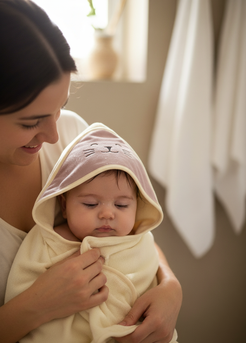 Accompagnée de son gant assorti, cette cape de bain transforme chaque sortie du bain en un moment plein de douceur et de complicité.