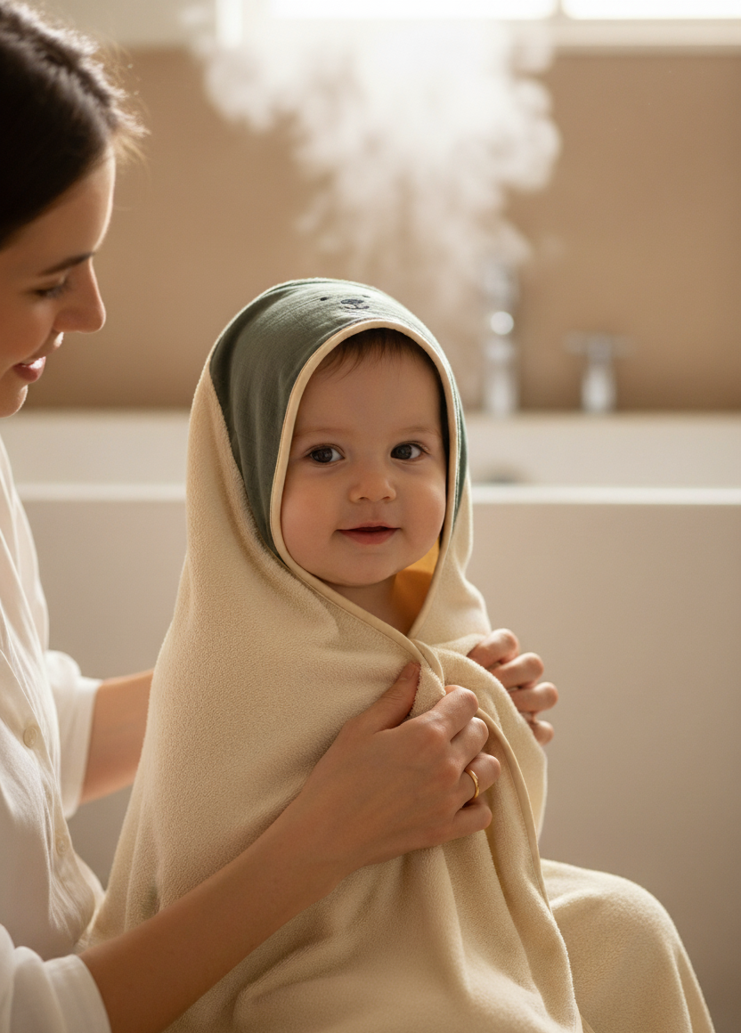 Accompagnée de son gant assorti, cette cape de bain transforme chaque sortie du bain en un moment plein de douceur et de complicité.